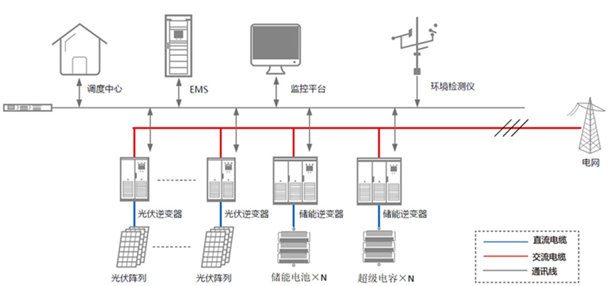 C)、超級電容和鋰離子電池配合,實現(xiàn)不同時間級別的功率平抑功率輸出波動、配合電網(wǎng)進行快速一次調(diào)頻和二次調(diào)頻,穩(wěn)定電網(wǎng)頻率,提升了電網(wǎng)對新能源場站的并網(wǎng)消納能力。